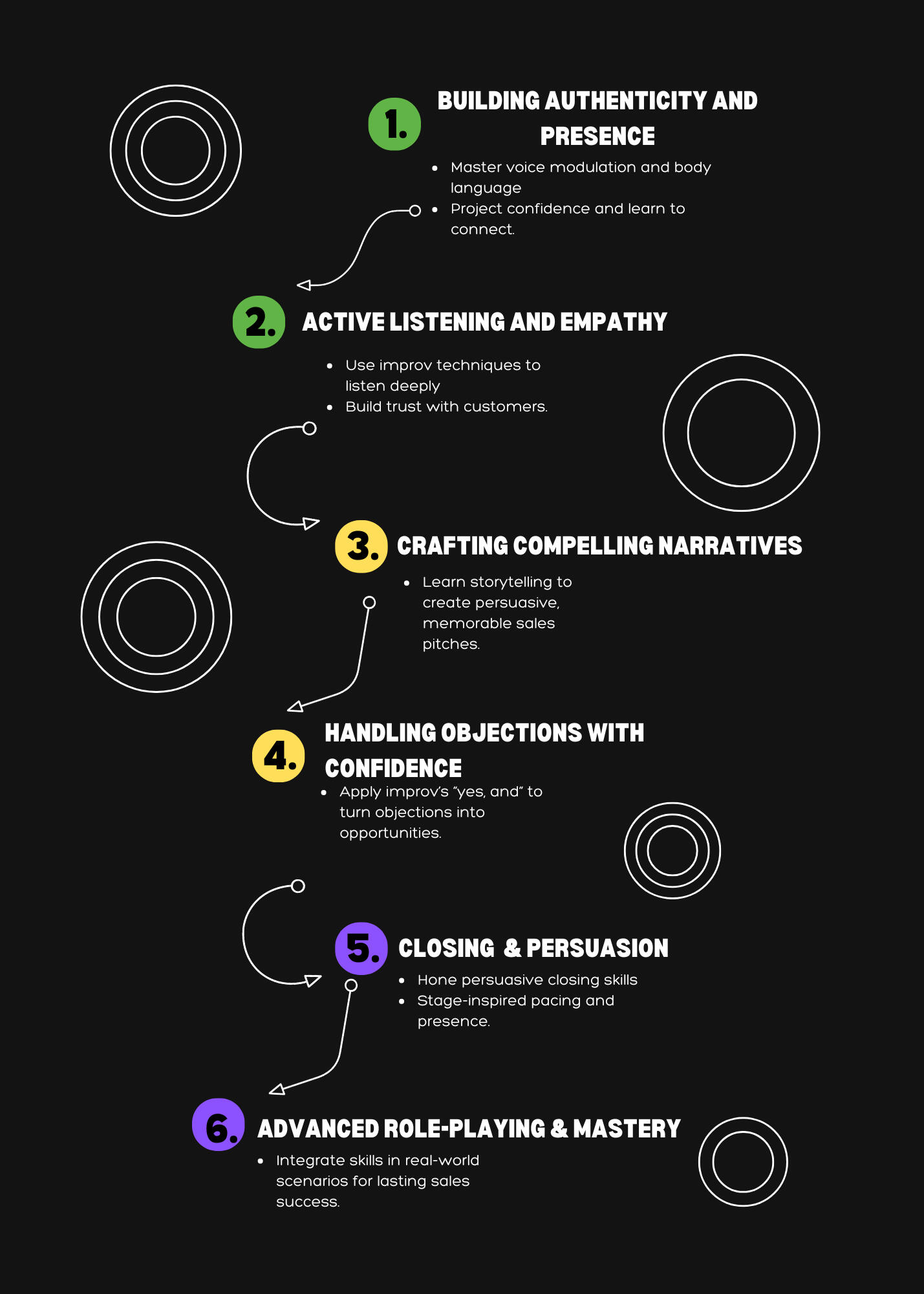 Command the Close is a transformative 6- or 12-month workshop program designed to elevate your sales team’s performance through the power of acting techniques. Each month, our 2-hour sessions blend proven strategies from the stage—voice modulation, body language, improvisation, and storytelling—with practical sales tactics to build confidence, deepen customer connections, and boost close rates.
